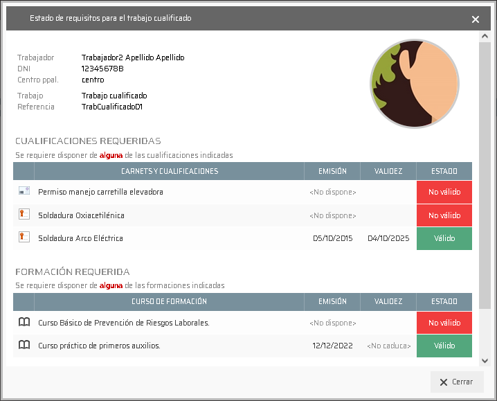 Si hace doble clic sobre alguno de los trabajos cualificados que se muestran en esta pantalla, accederá a una ficha detalle donde podrá verificar los requisitos para la realización del trabajo cualificado, con los que cumple el trabajador para su desempeño.