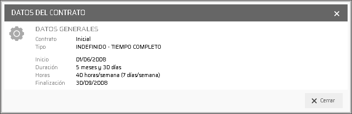 En la pestaña de 'Datos contractuales' se mostrarán los datos de los contratos registrados en Prevengos en la ficha de datos del trabajador. Si pulsa sobre uno de los contratos, accederá a una ficha detalle con los datos generales de ese contrato.