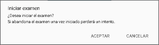 Al pulsar sobre el botón para comenzar el examen, aparece esta advertencia, que avisa sobre la pérdida de intentos con el abandono de ésta.