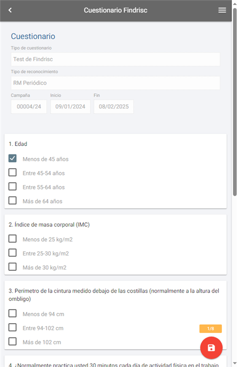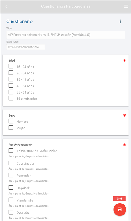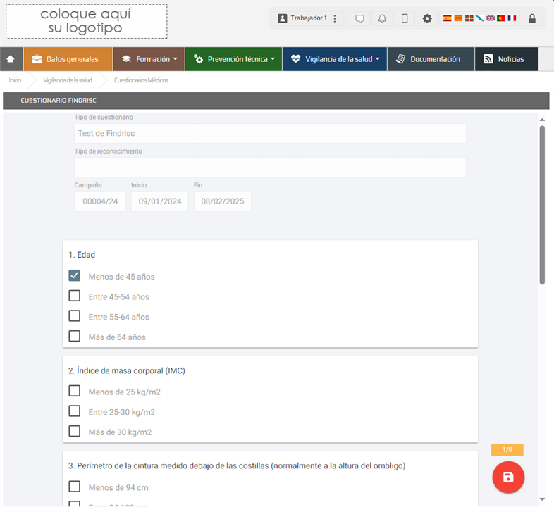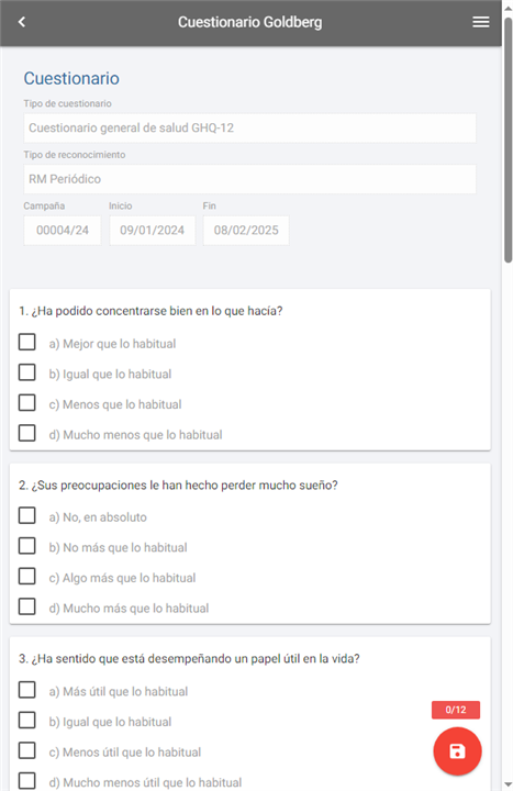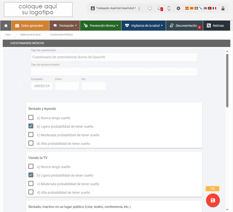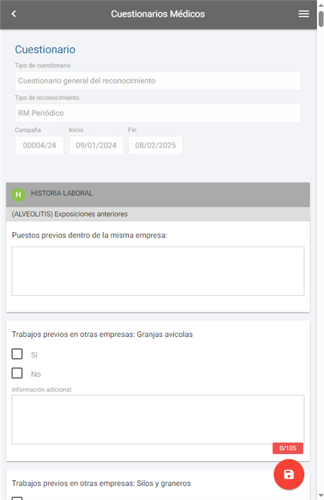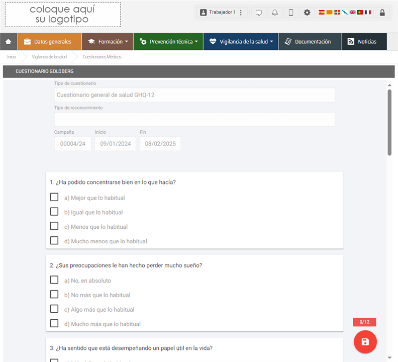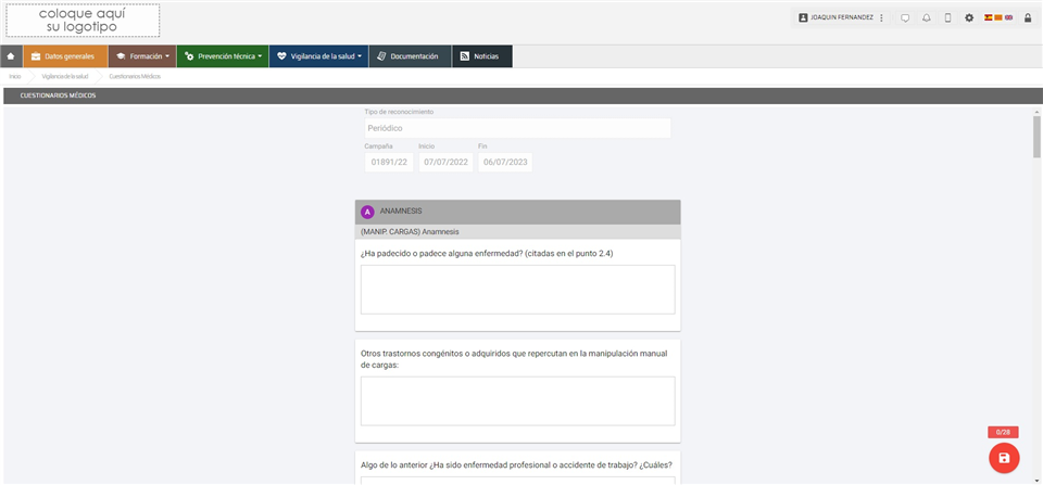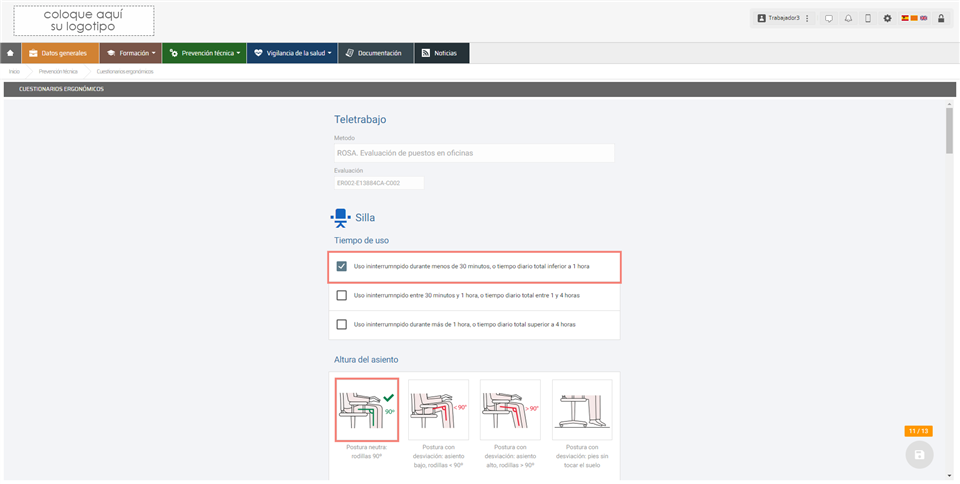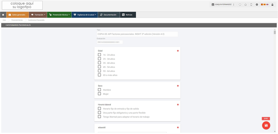 Por otro lado, podrá cumplimentar los cuestionarios ergonómicos en curso, en los que se guarda todo el progreso aunque no hayamos lo hayamos finalizado. Para finalizarlo, se nos habilitará el botón de guardar cuando hayamos cumplimentado el cuestionario entero. Una vez finalizado, no se podrá editar.