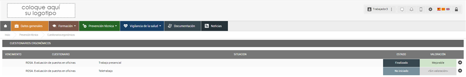 - Cuestionarios Ergonómicos. Acceso al histórico de cuestionarios ergonómicos en los que el trabajador está incluido. Desde aquí podrá ver el estado y la valoración de cada uno de ellos, pudiendo cumplimentar aquellos que estén pendientes.