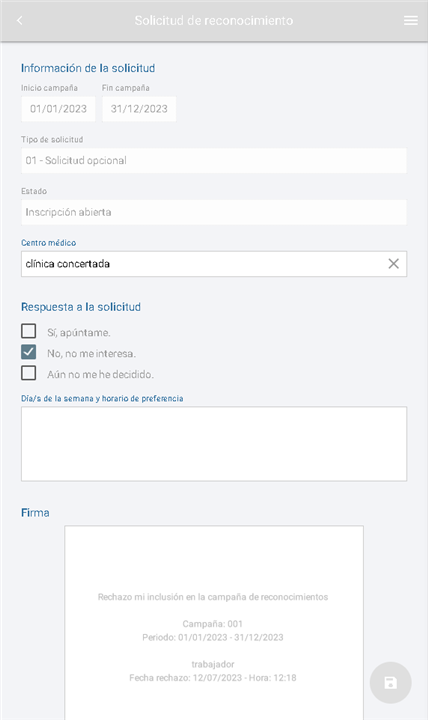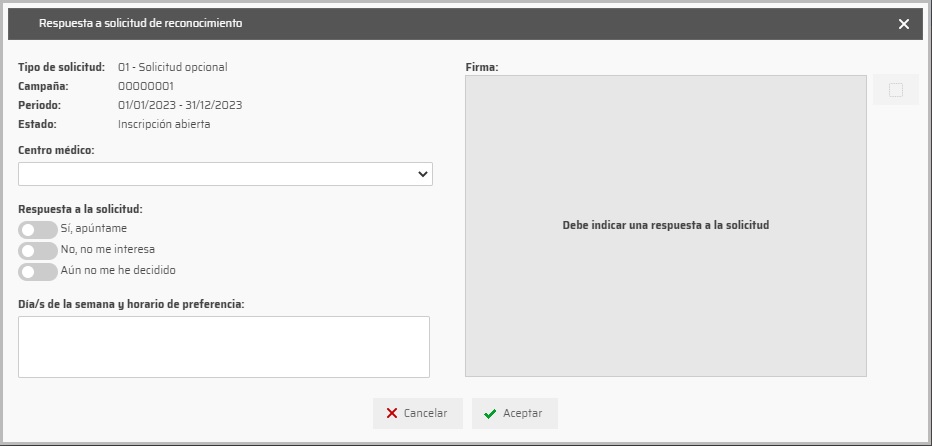 Si el trabajador está incluido en alguna campaña de solicitud de reconocimientos médicos, al pulsar sobre este botón le aparecerá un listado con dichas solicitudes, para que pueda confirmar o rechazar la realización del reconocimiento médico que se le ofrece en dicha campaña. Al pulsar sobre alguna de las solicitudes, se mostrará un formulario como el de la siguiente imagen, donde podrá indicar si quiere realizar el reconocimiento, el centro médico donde desea realizarlo e incluso el día de la semana y la hora de preferencia. Para finalizar la confirmación de la realización del reconocimiento, tendrá que firmar en el recuadro habilitado para su firma.