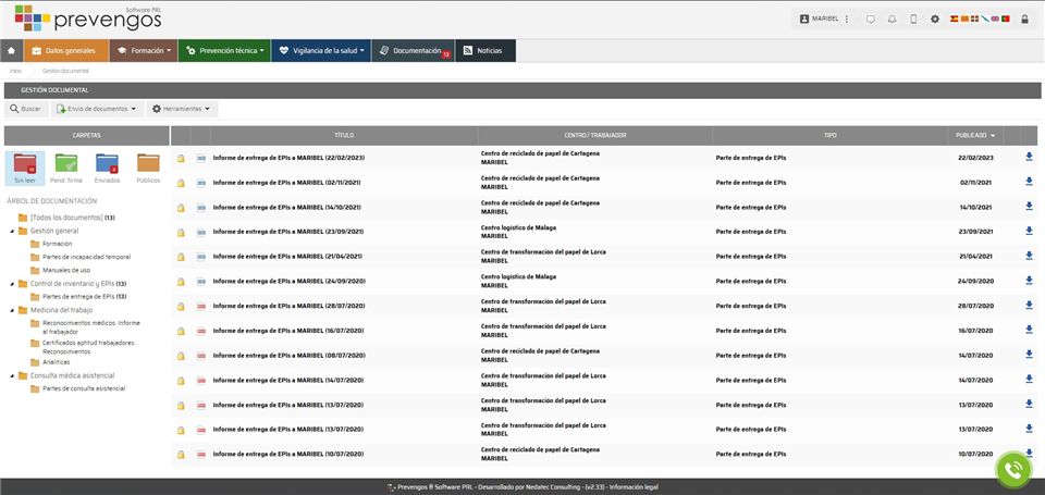 Desde este apartado el trabajador tendrá acceso a todos los documentos generados, y publicados desde Prevengos.
