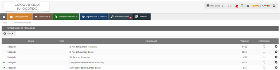 - Cuestionarios médicos. Si el trabajador tiene planificado algún reconocimiento médico, planificado en una PVST que tenga habilitada la cumplimentación a través del portal web, en esta pantalla le aparecerá el listado de cuestionarios médicos que debe cumplimentar.
