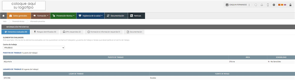 - Información preventiva. En este apartado aparecerán la información de las evaluaciones de riesgos en las que se haya incluido al trabajador. Esta información estará distribuida en varias pestañas: