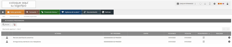- Actividades programadas. Listado de actividades programadas en el programa anual de actividades de medicina, en las cuales el trabajador es responsable. Por defecto aparecen sólo actividades pendientes, pero pulsando el botón