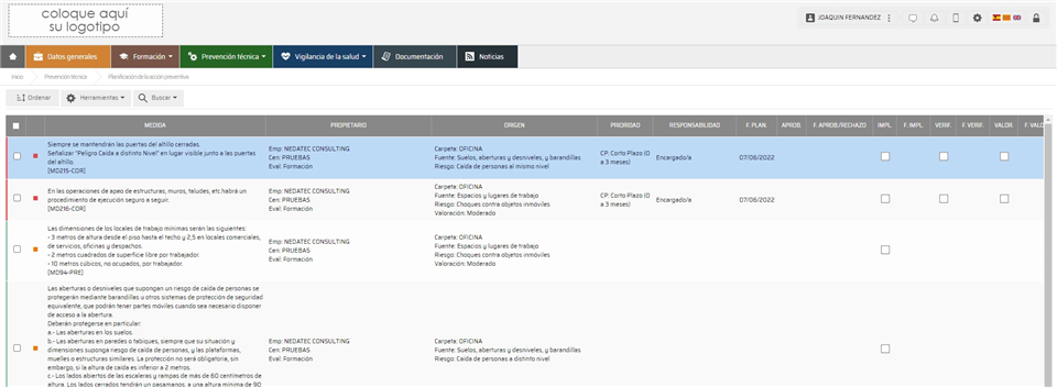- Planificación de la acción preventiva. En esta pantalla el trabajador podrá ver el listado de medidas planificadas en evaluaciones, partes de inspección, no conformidades, etc. En las cuales se ha indicado que el trabajador es responsable en alguna de sus fases (implantación, aprobación o rechazo, verificación de implantación, etc.). El trabajador desde aquí podrá editar la medida modificando la información de las fases en las que sea responsable.