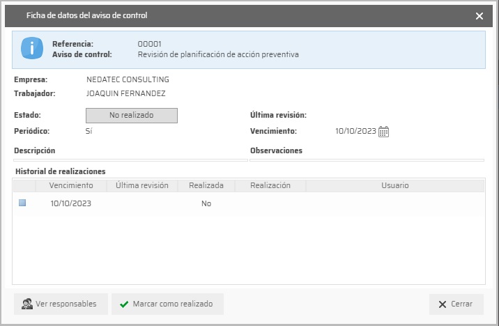 - Avisos de control. Si el trabajador es responsable de algún aviso de control, aparecerá en este apartado, donde el trabajador, con los menús desplegables de la parte superior, podrá buscar avisos, o cambiar la vista de los avisos que tiene en el listado. Si pulsa sobre algún aviso, aparecerá una pequeña ficha con el detalle del mismo, en el que podrá dar la tarea por realizada, pinchando sobre el botón 'Marcar como realizado' que aparece en la parte inferior del formulario.