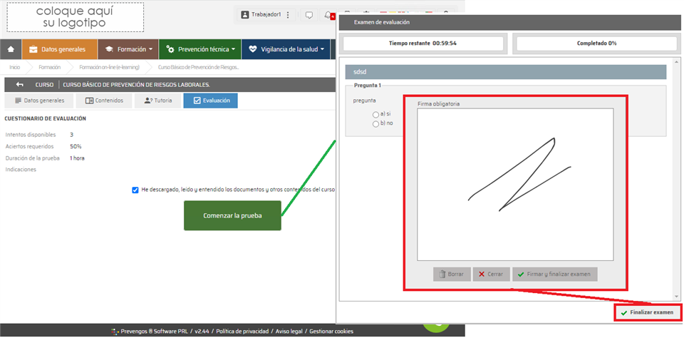 - Evaluación. En este apartado el trabajador podrá realizar el cuestionario correspondiente al curso de formación en el que se encuentra. Si el trabajador no ha realizado el examen, aparecerá un botón que sólo estará habilitado, si se encuentra entre las fechas en las que está habilitado el curso para su realización.