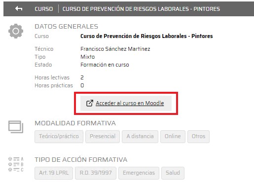 - Datos generales. Muestra información general del curso como título, fechas, temario... En este apartado, si el curso se va a realizar en 'Moodle', el trabajador encontrará un botón de acceso al curso en dicha plataforma para la realización del curso.