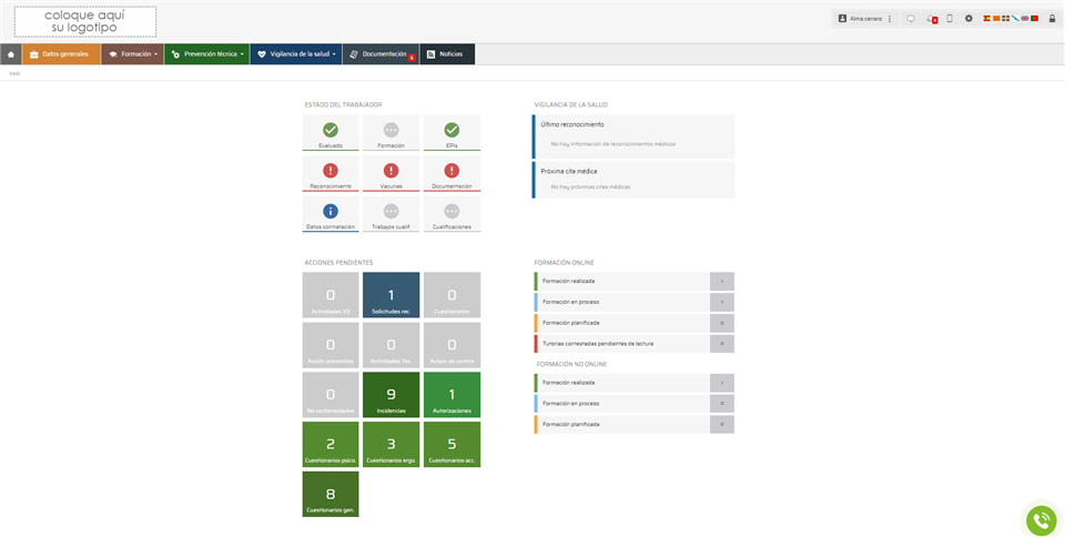 - ACCIONES PENDIENTES, donde visualizará cualquier acción en la que sea responsable que está pendiente de realizar, como por ejemplo, actividades del programa anual, cuestionarios médicos, cuestionarios generales, actividades de la planificación de la acción preventiva, cuestionarios psicosociales o ergonómicos, incidencias, etc.