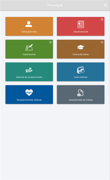 Si el trabajador tiene que cumplimentar algún cuestionario, ya sea general, psicosocial, ergonómico o de vigilancia de la salud, se le mostrarán en este apartado. Al acceder, se mostrarán dos botones, para que pueda diferenciar si el cuestionario es 'Médico', Psicosocial o General tal como se muestra en la siguiente imagen. Si tiene algún cuestionario pendiente, en la parte superior derecha de los botones, aparecerá una burbuja con el número de cuestionarios pendientes.