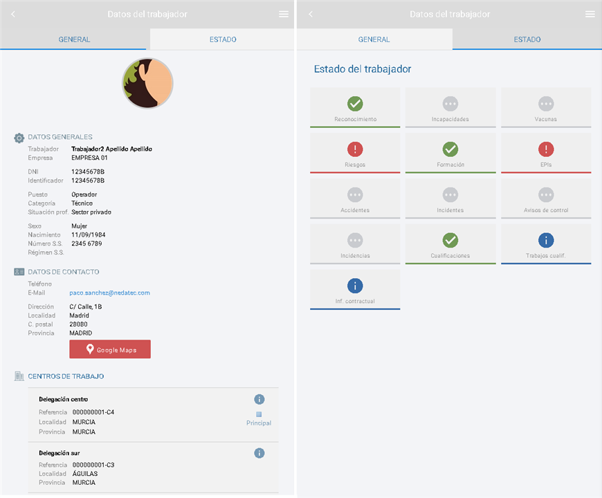 En el caso de la versión móvil, el apartado de los datos generales del trabajador tiene dos pestañas. En la pestaña 'General' podrán visualizar los datos generales del trabajador (nombre, DNI, datos de contacto, etc.), mientras que en la pestaña 'Estado' se mostrarán varios iconos que informan sobre el estado del trabajador, relacionados con los datos que se recogen del mismo en Prevengos. Estos iconos a su vez son accesos directos a la información relacionada con el trabajador, por lo que si pulsa sobre uno de estos iconos, por ejemplo, sobre el de 'Reconocimiento', accederá a la información relacionada con su reconocimiento médico.