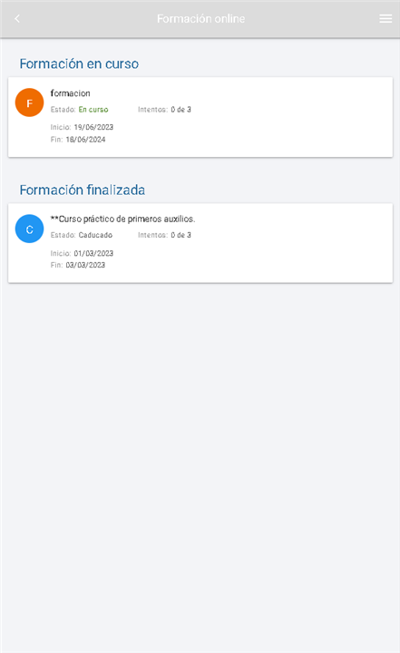 Al acceder al apartado de formación en la versión móvil, encontrarán los botones que se ven en la imagen que mostramos a continuación: